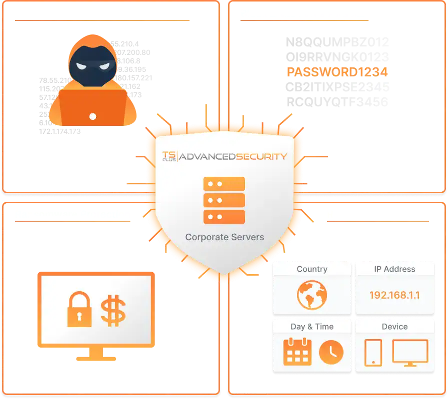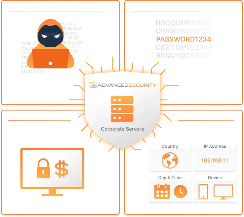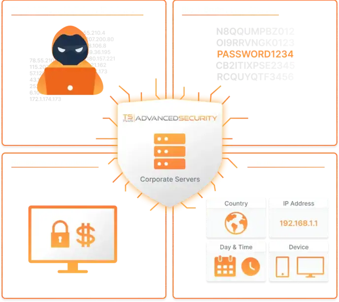 TSplus Advanced Security delivers specialized TSplus RDP protection and complete Remote Desktop cybersecurity. It combines brute force defense, anti ransomware for Windows Server, IP filtering, and geo blocking into one centralized security platform.